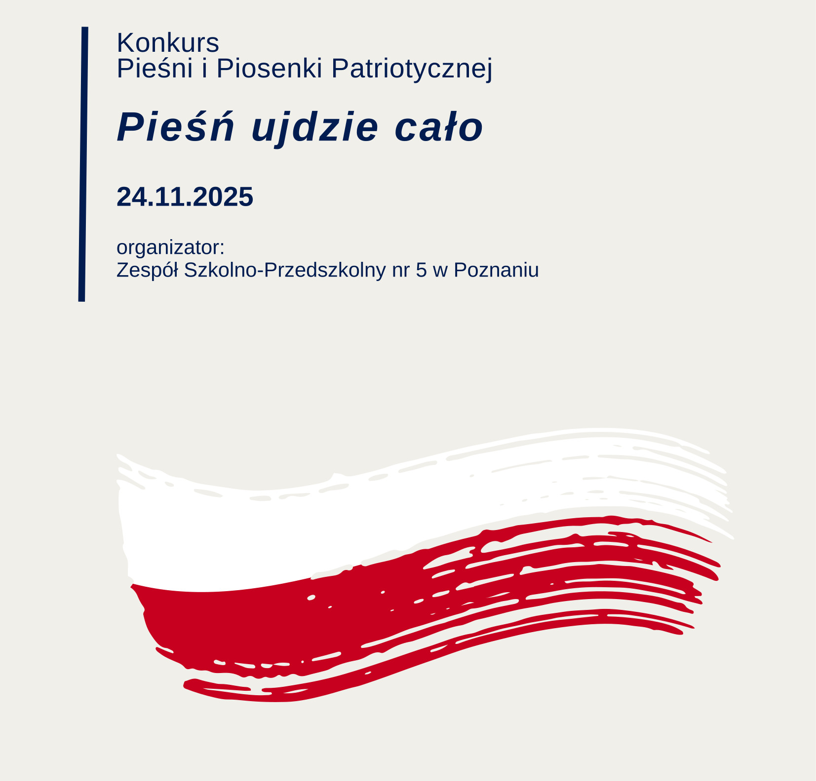Serdecznie zapraszamy uczniów szkół podstawowych do wzięcia udziału w Konkursie Pieśni i Piosenki Patriotycznej Pieśń ujdzie cało. Konkurs odbędzie się 24.11.2025 r. o godz. 10:00 w Szkole Podstawowej nr 65 w Poznaniu. Konkurs przeznaczony jest dla solistów, którzy oceniani będą w 3 kategoriach wiekowych: