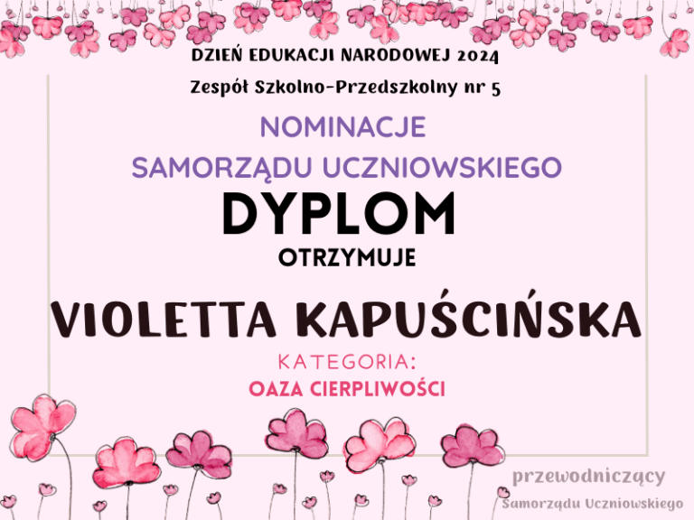 Chociaż powoli zaczynają deptać jej po piętach inni nauczyciele, w tej kategorii od lat zwyciężczyni jest jedna,. W kategorii OAZA CIERPLIWOŚCI pierwsze miejsce po raz kolejny zajmuje PANI VIOLETTA KAPUŚCIŃSKA! (oklaski, zapraszamy, wręczamy dyplom, uścisk dłoni)