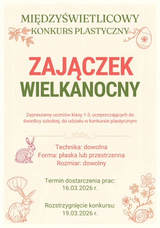 MIĘDZYŚWIETLICOWY KONKURS „Zajączek Wielkanocny” Wysłany 12.03.2026 przez Zofia Feliniak Regulamin… Karta zgłoszeniowa…