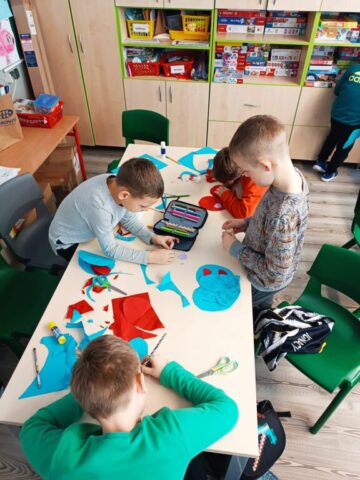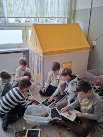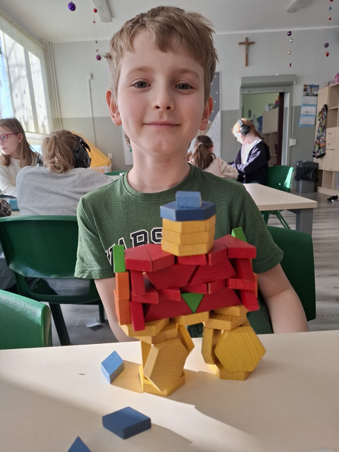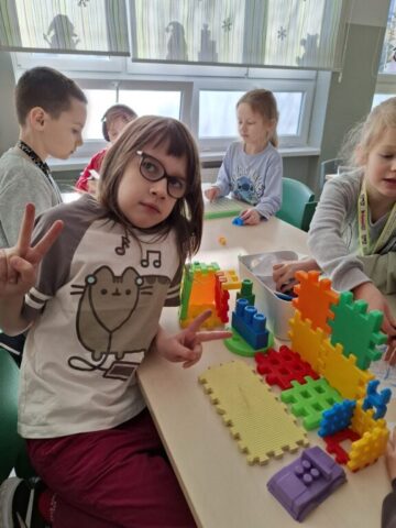 Dzieci z dużym zaangażowaniem układały puzzle, tworząc piękne obrazki i pomagając sobie nawzajem. Dużo radości sprawiły także zajęcia konstrukcyjne – uczniowie budowali różnorodne budowle z klocków, rozwijając wyobraźnię i zdolności manualne.
