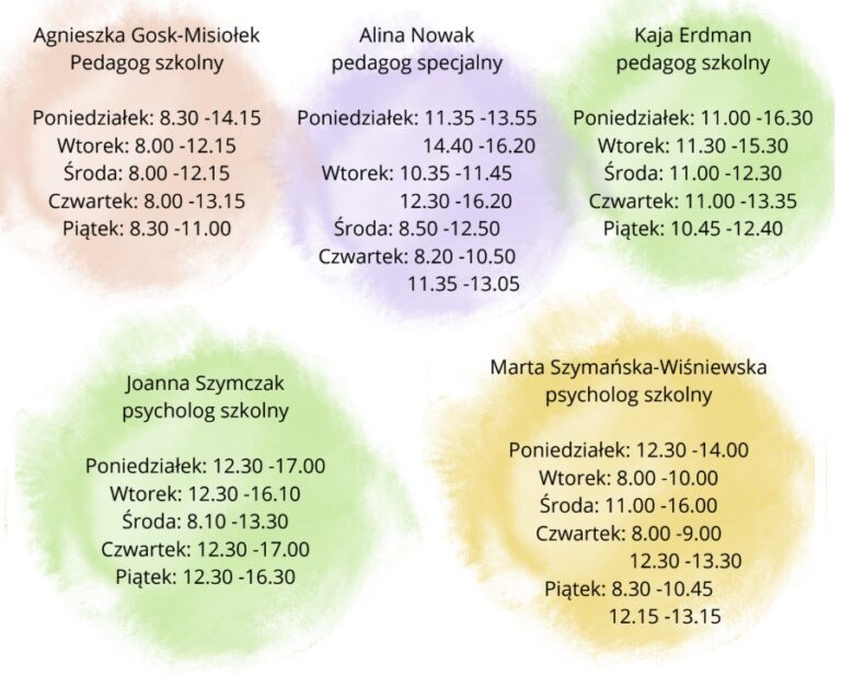 - prowadzenie zajęć logopedycznych dla uczniów oraz porad i konsultacji dla rodziców i nauczycieli w zakresie stymulacji rozwoju mowy uczniów i eliminowania jej zaburzeń;