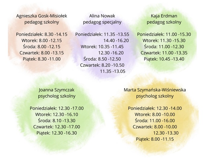 - prowadzenie zajęć logopedycznych dla uczniów oraz porad i konsultacji dla rodziców i nauczycieli w zakresie stymulacji rozwoju mowy uczniów i eliminowania jej zaburzeń;